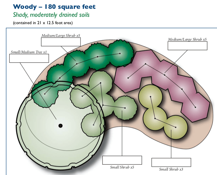 For more native plant design templates, check out RESOURCES/Anne Arundel Watership Stewards, which features a Conservation Landscape Design Tool with templates in multiple sizes (60 sq.ft., 90 sq. ft., 120 sq.ft., 180 sq.ft) for the following types of designs:
