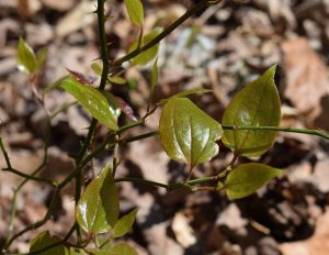 Greenbrier (Smilax) is an example of a plant armed with prickles on its stems. Despite its weediness and unfriendly prickles, this low-growing woody vine is native throughout North American and is not without merit. The fruits are a food source for many bird species. They eat the fruits and then pass them randomly throughout our landscape, which explains why the plants seem to appear out of nowhere.
