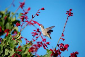 • Birds, of which about 2,000 species globally feed on nectar, prefer tubular flowers with curving petals that create a welcoming entry, perching supports and bright red, yellow and orange coloring. Scent is unimportant. Flowers should be open during the day, have a large quantity of nectar and a pollen structure that dusts the birds’ head and back as it forages for nectar. Hummingbirds are favorites to watch as their long, slender bills reach deep into flowers for nectar, withdrawing with their faces dusted in pollen.