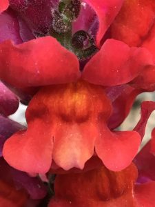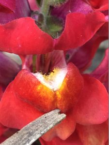 Snapdragons (see photo on left above) have a bee-visible landing area. Their sexual parts and nectar are hidden, but when the right sized bee lands on the designated spot, the petals open, revealing the nectar stash and pollination organs inside.