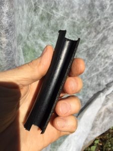 - Purchase a roll of coiled ¾” diameter pvc tubing. Cut it with a hack saw to an appropriate length for your situation. I use 8-foot lengths for my 4-foot wide raised beds and get a 36-inch hoop height which is good for the greens I grow under them. Slide the tube ends over a pair of rebar pegs to make a hoop.