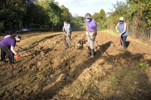 If you are planning a new garden or garden expansion for next year, fall is a good time to begin preparing soil. Tilling to remove or bury surface vegetation, adding organic matter, and mulching or cover cropping prior to winter are good preparation for next year. The picture above shows a new garden area operated by New Roots Charlottesville, our local arm of the International Rescue Committee, a PMG community garden partner. The surface grass in the bed has been tilled under and volunteers are preparing the surface for a winter hardy cover crop planting. Additionally, based on a soil test, lime was spread over the area to raise the low pH.
