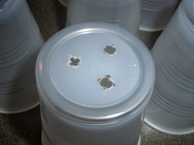 Holes punched in plastic cups for drainage.