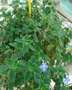 Streptocarpella is hardy in Zones 9 and 10, and it’s usually grown as a house plant in North America. Plant it in well-drained organic potting mix in a container that allows room below for the cascading stems — a plant stand is ideal. Place it in an area of bright light, but not direct sun. Windows that face either south or east are recommended. My plant is very happy in a south-facing window which is somewhat sheltered from direct sun. Water it regularly, and avoid getting water on the leaves because it causes browning. You’ll notice that the blooms appear on wiry “scapes” that are produced at the stem nodes. I’ve never pruned these after blooming, and my research suggests that no pruning is necessary. I DO need to repot my plant, which is getting potbound, but that’s an exciting prospect since by dividing it, I’ll gain a new one.