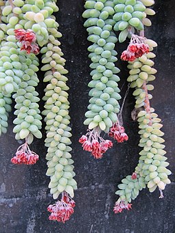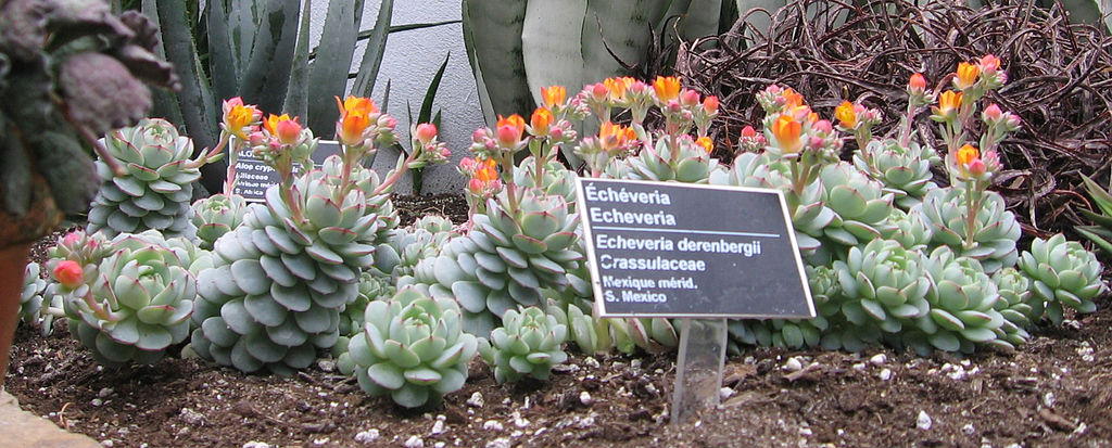 Echeveria derenbergii, commonly known as “painted lady,” also has small rosettes that produce many offshoots. Like most echeverias, it needs plenty of light. In the photo below, the “painted ladies” are blooming, but that’s probably because they’re in the care of a botanical garden that is providing the necessary conditions. Getting an indoor succulent to flower can be tricky. You may be able to bring cacti and succulents into bloom if you can re-create their native winter conditions. This requires good light, dry soil, and cool nights — which might be available on a windowsill.