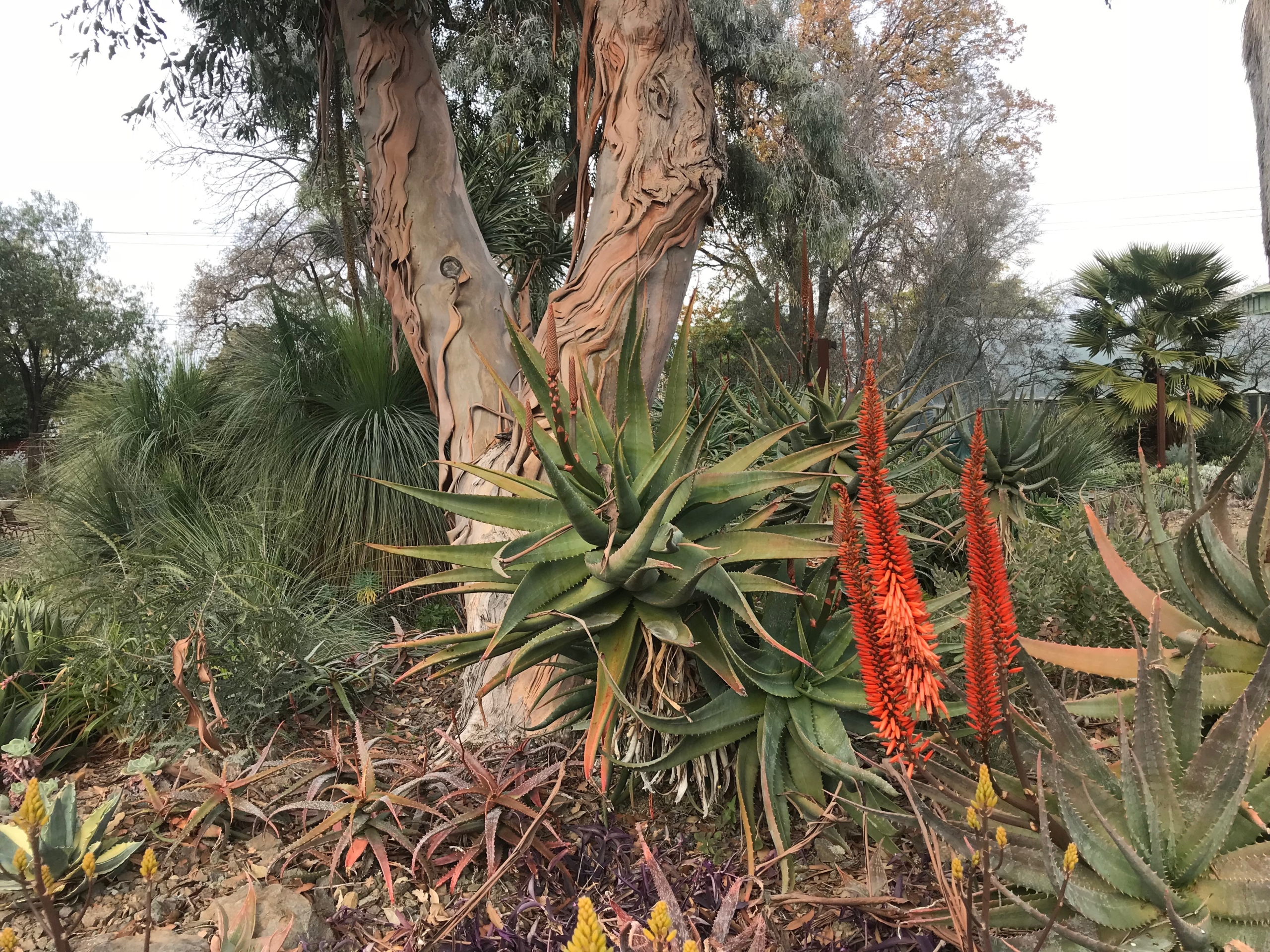 Actually, succulents — even the ones that are NOT cacti — have a lot in common with cacti. Most cacti and succulents are adapted to dry habitats, and are found in arid regions all over the world. Most are able to store water, enabling them to survive long dry periods. The word “succulent” means “juicy” — and, in truth, that’s exactly what they are, thanks to their ability to store water in their leaves and/or stems. And that brings me to another clarification: succulents and cacti can be classified as “xerophytes” — plants that thrive in dry conditions. But if you’re a plant, being “juicy” is not the only way to adapt to an arid climate, so a xerophyte may or may not be a succulent plant. Drought-ridden California seems to be headquarters for gardens devoted to xerophytes, the Ruth Bancroft Garden being one example.