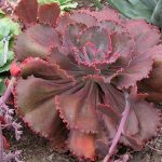 Echeverias (etch-eh-Veer-ee-ah) have rosettes of white, pink, and shades of blue. Most remain a few inches high and wide. Don’t let water sit in the rosettes or it may lead to rot. Remove any dead, lower leaves.