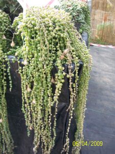 Senecio rowleyanus, commonly known as “string of pearls” or “string of beads” is a succulent vine of the aster family. It is native to dry areas of southwest Africa. Talk about a show-stopper!