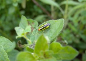 Four-lined Plant bug on oregano leaf. Photo: Missouri Botanical Garden