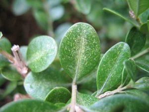 Spider mite stippling damage on boxwood leaves. Photo: Missouri Botanical Garden