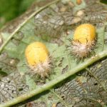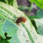 The larva are cylindrical and soft-bodied. They are yellow and covered in spines that are either black or yellow with black tips. They generally remain on the undersides of the leaves where they continuously feed on leaf tissue. The larva will go through four developmental stages or instar stages over an average of 20 days. The first instar stage develops in 4-6 days, the second instar lasts about 2-4 days, the third instar stage develops over 3-5 days, and the fourth and final instar stage develops over a 6-10 day period.