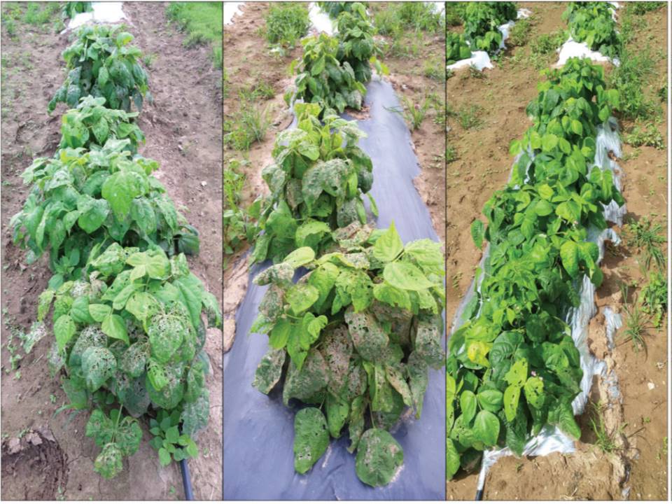 Mexican bean beetle adult and larvae are deterred by direct light. Field experiments at Virginia Tech have shown that Mexican bean beetles are less likely to colonize and deposit eggs on beans mulched with metalized and white plastics, compared to bare ground and black plastic. There was also less foliar and pod damage and significantly greater yield when the beans were mulched with metalized and white plastics than beans grown on the bare ground or mulched with black plastic.