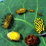 Eggs of the Mexican bean beetle are light yellow when first deposited but darken when they are close to hatching. They are generally deposited in clusters of 40-60 eggs per cluster on the underside of the bean leaves. Each female will lay an average of 460 eggs. In 5-14 days, depending on the temperature, the eggs will hatch.