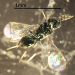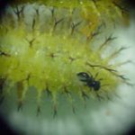 The female wasps lay about 20 eggs in a single bean beetle larvae. The wasp larvae hatching from these eggs kill the beetle larvae. The infected larvae eventually turn brown and die. Adult wasps emerge from the larvae after about 15 days, mate, and then search for more beetles to infect. These wasps will also parasitize the larva of the squash beetle, a closely related relative of the Mexican bean beetle that feeds on cucurbit plants. These black wasps are very small — about 1-2 mm long –and will not harm humans or beneficial insects.