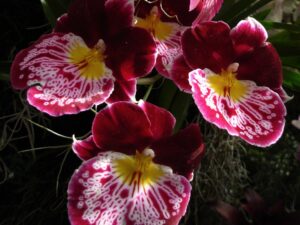 Commonly referred to as “pansy orchid” or Miltonia, this species has become very popular because of its charming, large, flat blossoms, which are available in a wide range of colors. Each flower has a butterfly-shaped design in a contrasting color in its center.  It grows from pseudobulbs, which should be grown in a fine-grain bark mix. This plant needs bright light but no direct sun.  It does not like temperatures above 80°F.  Pansy orchids need to be kept evenly watered.  Otherwise, the new leaves will begin to take on an accordian-fold appearance and will not flatten out again.