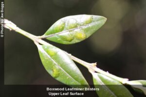 Boxwood leafminer damage is a more serious problem. The small, delicate adult flies are generally seen in late April and early May, but it’s their larvae that cause the damage. As the larvae feed on the leaves, they cause unsightly blisters to develop in the leaf tissues. While chemical means may be employed to combat this pest, organic methods may be sufficient. Green lacewings and spiders are natural leafminer predators. Other strategies include timely pruning of damaged foliage in spring and selecting boxwood species that are resistant to leafminer damage. A number of reliable sources for information on boxwood leafminers are available including Virginia Cooperative Extension (VCE) Publication ENTO-42NP on Insect and Mite Pests of Boxwood; VCE Publication 426-603 on Selecting Landscape Plants: Boxwoods; the Missouri Botanical Garden’s publication on Boxwood Leafminer; and the North Carolina State University’s Department of Entomology Insect Note, also called Boxwood Leafminer. Tip: For help identifying insects, see Bugs and Other Insects from the State of Virginia.