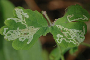 With the arrival of spring comes the start of the annual battle with insects, such as leafminers. Leaf miners are the larvae of moths (Lepidoptera), sawflies (related to bees and wasps and members of Hymenoptera suborder Symphyta) and flies (Diptera). The larvae tunnel into and devour the inner layers of the leaves, leaving round or winding, white tunnels. The tunnels are commonly found on the foliage of columbine (Aquilegia) and roses. While the damage doesn’t actually harm the plant, it can look unsightly. Chemical controls, such as Spinosad or BT, can be used but may not be necessary. It’s usually easier to snip off the damaged leaves or simply ignore the problem if it’s not too pervasive.