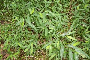Treatment: Hand-pulling small infestations before plants set seed is effective but labor intensive. Plants pull easily from moist soil. Consider hand-weeding around desirable native plants before applying herbicide. Mowing and weed-whacking can greatly reduce seed formation. Mowing is feasible only in open areas, not in forest settings. If stiltgrass is cut in June, flowers low on the stems may bloom earlier than usual, so repeat mowing is needed. Mowing is best done just before flowering in August and September and needs to be done only once if you wait until then. Cut stiltgrass as low as possible, scalping the ground, to remove all flowers.