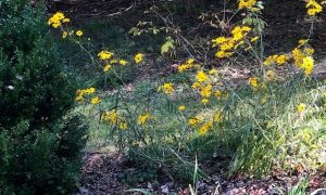 Late bloomers, such as asters, chrysanthemums, and sedums, can be pinched back until mid-July to encourage a fuller, sturdier shape. This term means that you literally pinch out the growing tip and first set of leaves (about ½ to 1 inch) of each stem between your thumb and forefinger. Pinching back encourages the growth of side shoots; it will delay blooming somewhat, but the fuller plant shape and stronger stems are worth the wait. I’m trying this technique on Helianthus angustifolius, a new addition to my garden last year. Its blooms were lovely and so welcome at the end of summer, but it has a rangy habit, as you can see in the photo at right.