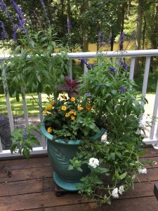 Some of our annuals in the garden and in containers are beginning to look a little spent. But when the hummingbirds and the bees are still daily visitors, it’s hard to callously discard popular sources of nectar such as annual salvia. Another alternative is to save the healthiest plants with the most complementary fall colors and add fresh plants. In the summer, I like to work with blue, lavender, pink and white. In the fall, I remove from the containers pink flowers as well as any plants that are spent, and add fresh plants in colors of gold, orange, burgundy and rust. It takes just a few weeks for the newcomers to fit in with their fuller, taller, established companions. Sometimes it doesn’t take much to create a new autumnal palette!