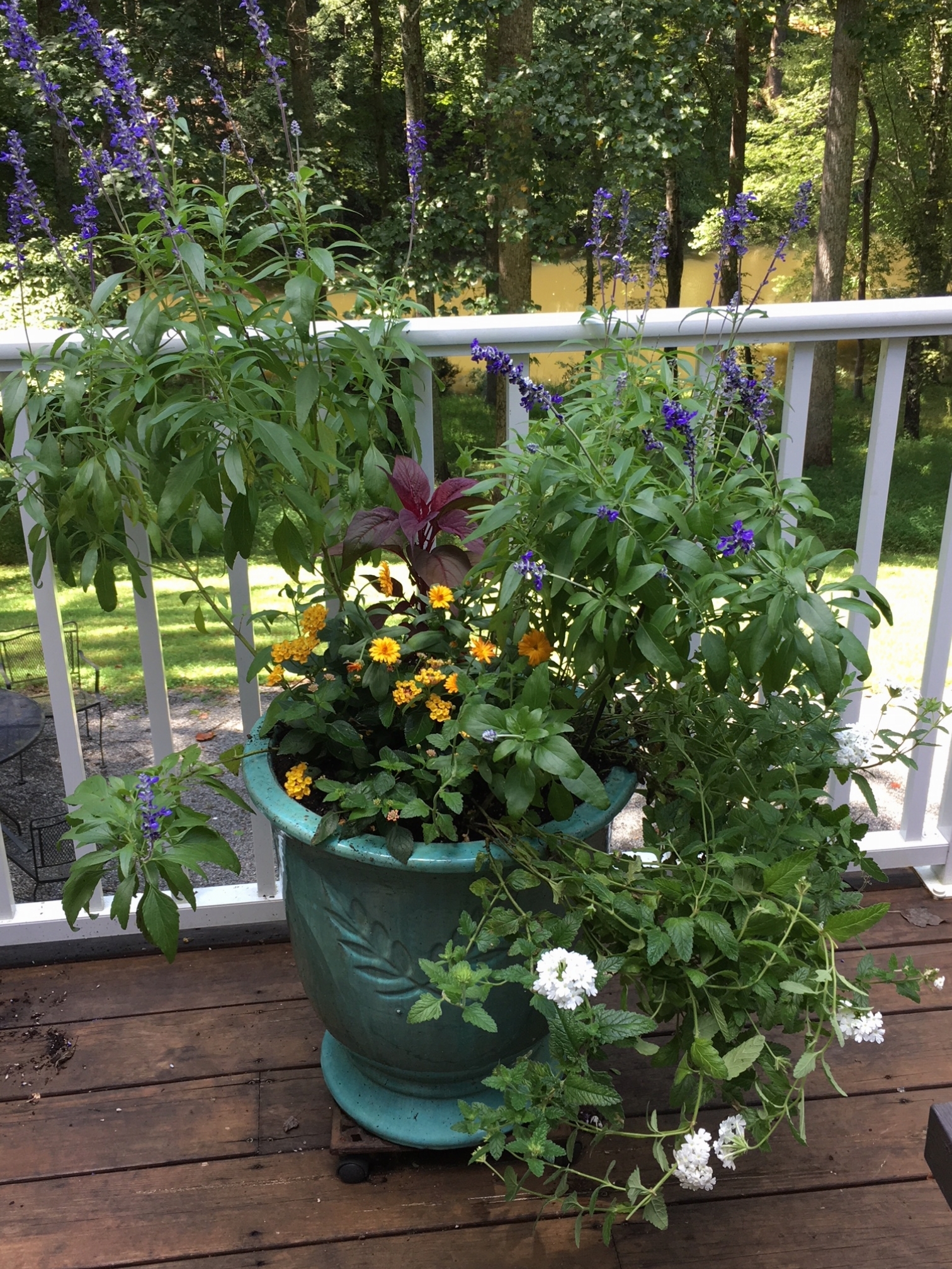 In Container 1, pictured below, I removed pink Angelonia augustifolia (summer snapdragon). At some point, I’ll probably also need to take out the annual blue salvia, but since it’s still a pollinator magnet, I’ll keep it a while longer. I also kept trailing white verbena and then added Bandana® Lantana camara, Lady Godiva™ yellow Calendula hybrid (English marigold), and Celosia argentia ‘Dragon’s Breath’.