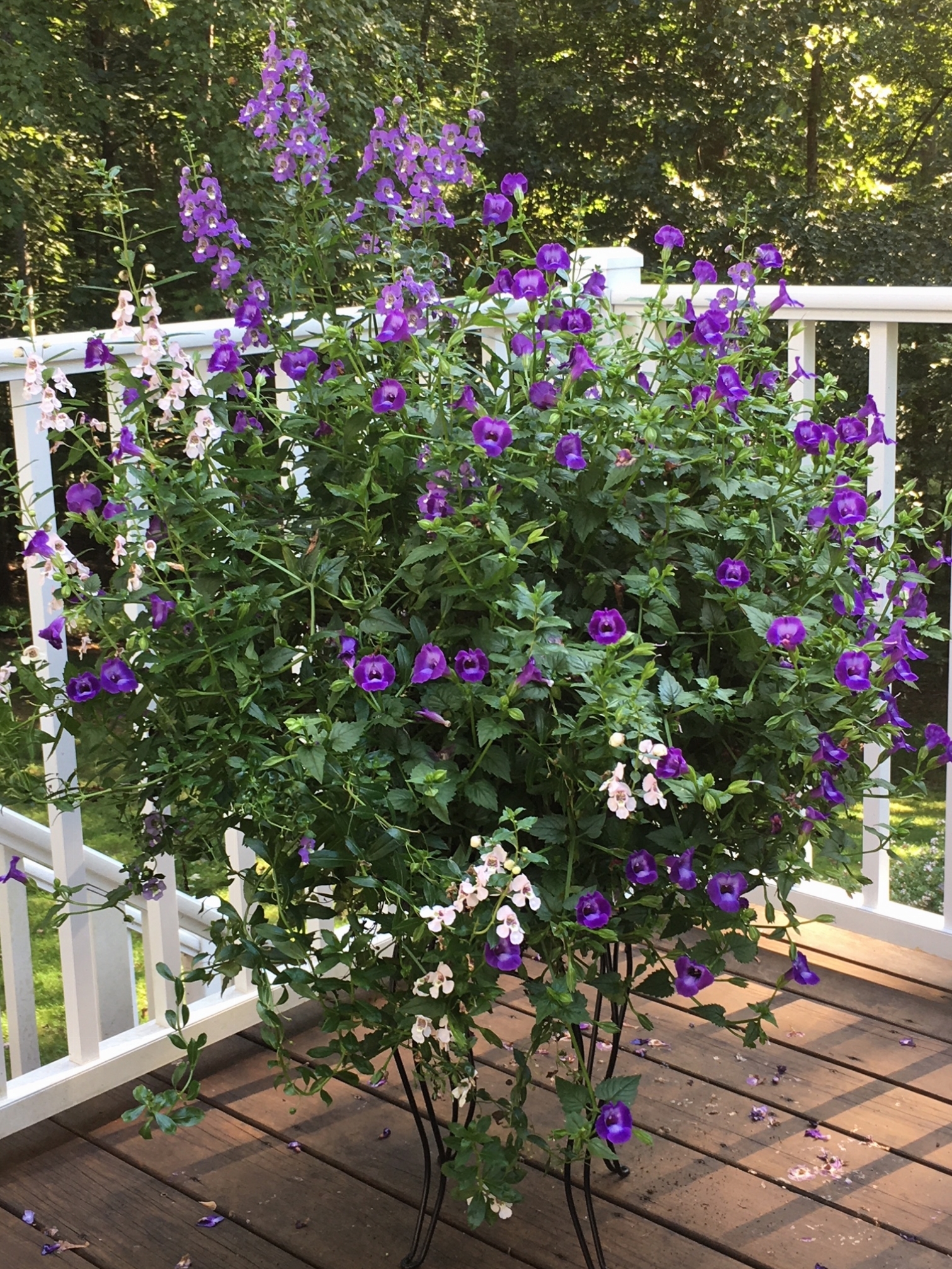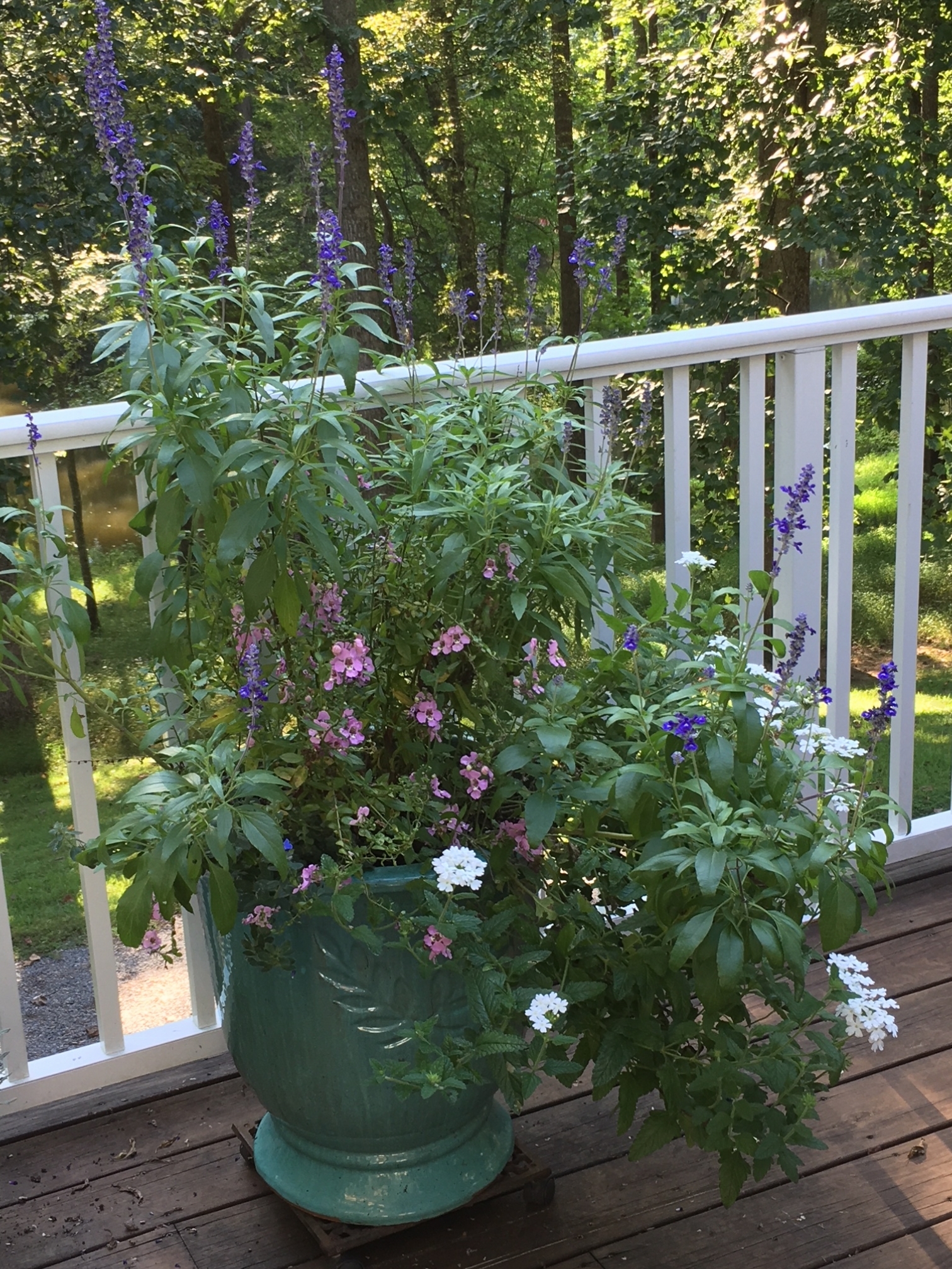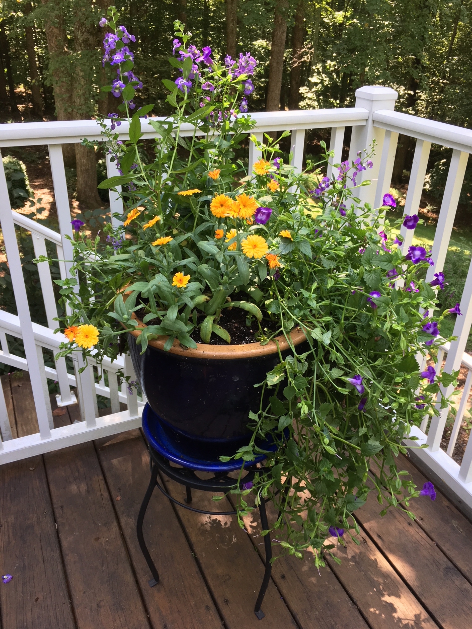 Container 2 was a mass of purple Torenia fournieri (wishbone flower) and angelonia in purple and pale pink. I removed the pale pink angelonia and added Lady Godiva™ Calendula. Both planters will need some additional tinkering as September wears on, but for now, they look fresher and more seasonal.