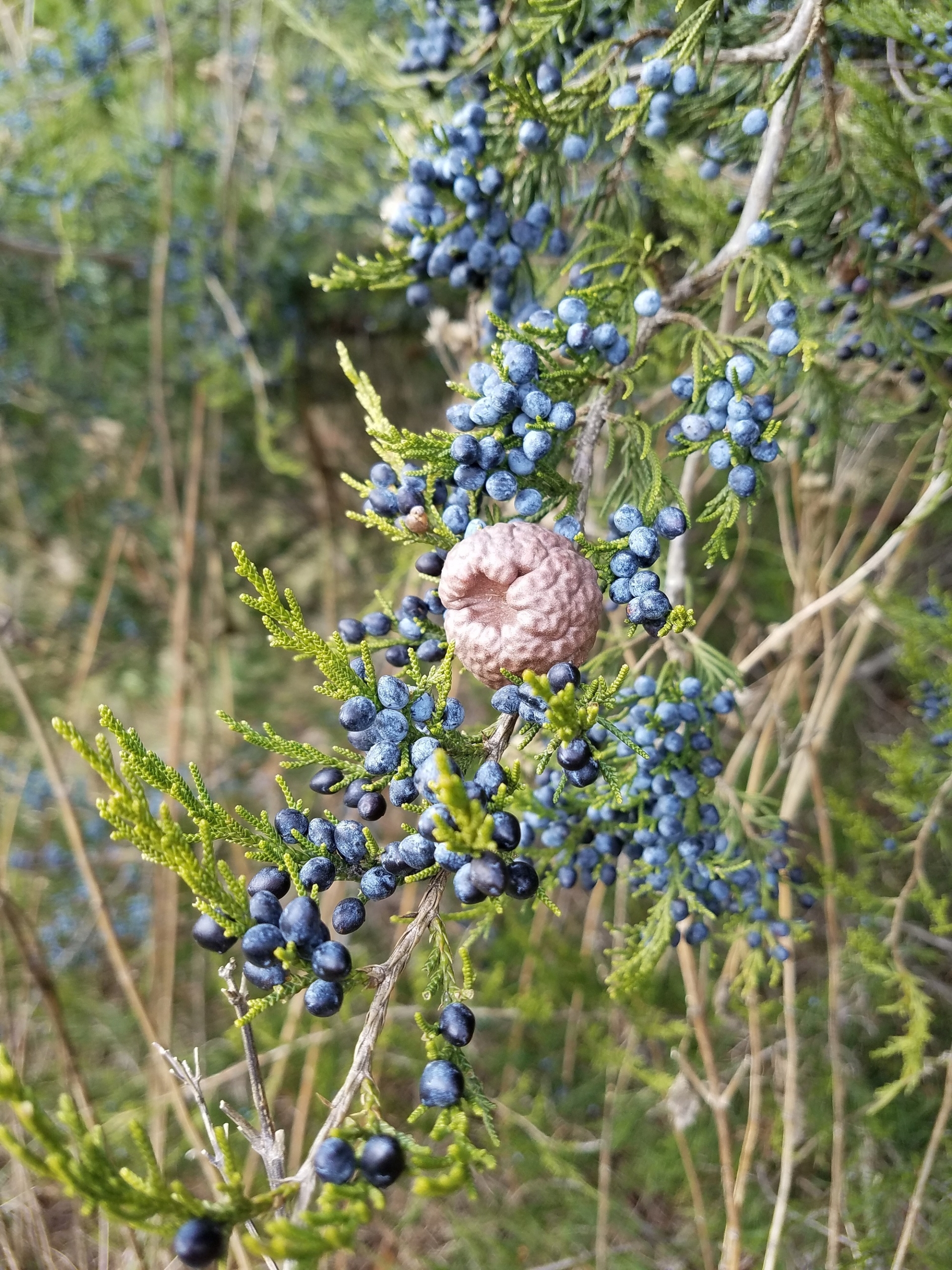 Another problem with the eastern redcedar is its role as an alternate host for cedar-apple rust, a Gymnosporangium pathogen that is destructive to pome fruit trees such as apple, pear, and quince.  By the way, pome fruits are members of the plant family Rosaceae, sub-family pomoideae.