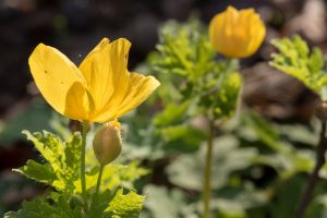 Another April bloomer is Stylophorum diphyllum, commonly known as wood poppy or celandine poppy, which bears bright yellow (though sometimes orange-ish) flowers. It will re-bloom if cut back. This perennial is native to a large portion of North America, from Wisconsin and Michigan south to Arkansas, Tennessee, and southwestern Virginia, and is occasionally found in northern Alabama and southern Ontario. Like the trout lily, it prefers moist humus-y soil in a shady location, but is somewhat drought-tolerant. It is a self-seeder, although chipmunks and mice love to eat the seeds. Sadly, some scientists say that this plant’s survival in the wild may be threatened in some locations by the invasive garlic mustard, which apparently disrupts the mycorrhizal fungi associated with wood poppy — and some other native plants, as well. NC State Extension,