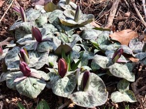That’s when I saw my first Little Sweet Betsy (Trillium cuneatum), which has quite a few other common names, my favorite being toad trillium. According to my research, this southeastern U.S. native is usually found in shady, moist areas of forests. It is sessile in form, which means it lacks a stalk. Its seeds are spread by ants (a process known as myrmecochory). And why do ants take up this task? It’s because they feed the elaiosome (a small oily structure attached to a seed) to their offspring. Unfortunately, we humans apparently have difficulty growing it from seed, on top of which, it does not transplant easily. Bloom color can vary; usually it’s maroon, but sometimes yellowish bronze or reddish-green.