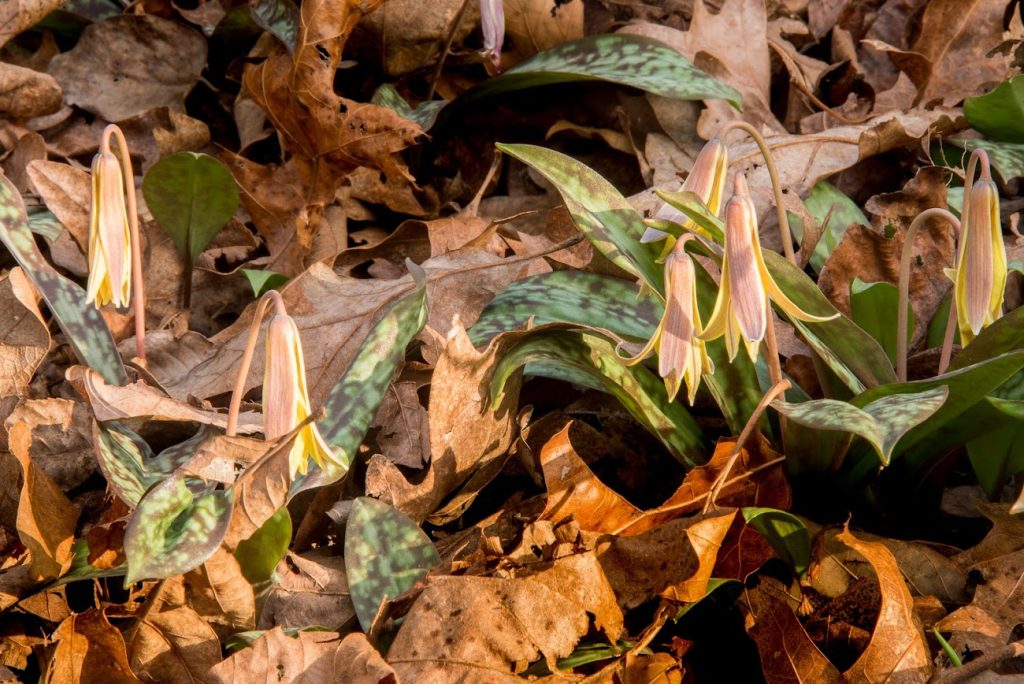 The trout lilies’ delicate blooms appeared later, in April (see photo below). Like many ephemerals, the trout lily goes dormant in late spring. The root system consists of a corm (bulb-like structure) with fibrous roots. Trout lilies spread via rhizomes, often creating large colonies in the right conditions — i.e., shady areas with moist, humus-rich soil. This plant requires some sun in early spring, which a deciduous forest provides. If you’re starting your own colony, beginning with a corm is recommended. You have to be patient for the flowers as it often takes 4 to 8 years to mature to the blooming stage.