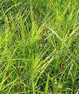 - C. vulpinoidea, fox sedge, grows well in damp to very wet soils in full sun to partial shade. Narrow grass-like leaf blades grow in clumps up to 3’ in height. The seedheads, which spray out attractively from the center of the clump, resemble a fox’s tail but are short-lived. This sedge may be weedy and spreads rapidly. It is useful for water gardens or for locations that remain moist near streams, springs, or ponds. Deer resistant.