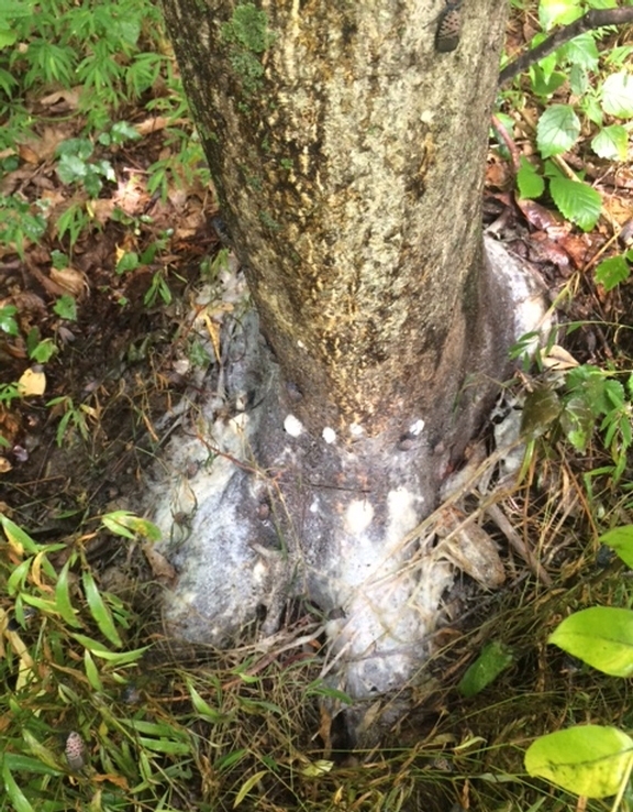 Sooty mold, such as shown in this example at the base of a tree, results from a combination of sap flows caused by the spotted lanternfly (Lycorma delicatula) and honeydew excreted by the insect. (Photo credit: Lawrence Barringer, Pennsylvania Department of Agriculture, Bugwood.org).