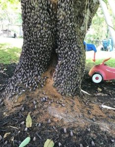 As the SLF sucks the phloem from trees and shrubs, it excretes large amounts of honeydew,  a sticky sweet substance which attracts, wasps, ants, bees, and other insects drawn to the sweet substance.  When walking under an infested tree canopy, the honeydew falls like rain.