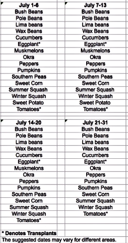July is a good month for filling in empty spaces left from those early-spent spring crops such as lettuce, English peas, potatoes, and radishes. July planting may include beans and squash and a host of other vegetables. Take a look at the handy-dandy chart below, which was developed using the Virginia Cooperative Extension Publication 426-331 “Vegetable Planting Guide and Recommended Planting Dates.”