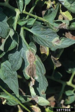 The late blight pathogen attacks all above ground parts of the tomato plant. The first symptoms of late blight on tomato leaves are irregularly-shaped, water-soaked lesions, often with a light halo or ring around them. Unlike early blight and septoria leaf spot diseases, these lesions usually begin on the younger, more succulent leaves in the top portion of the plant canopy and then migrate down the plant to the lower leaves.