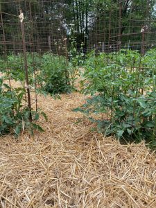 Tomatoes growing in reinforced wire cages. Photo Credit: Fern Campbell