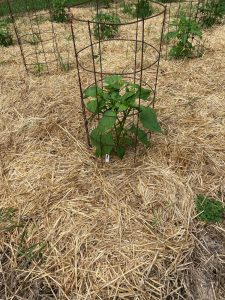 Peppers growing in conical wire cages. Photo Credit: Fern Campbell - Heavy-duty, tall tomato cages are available in a variety of designs and are made from powder-coated steel or heavy-duty plastic materials. They are designed to support indeterminate (vine-type) tomato varieties. Some of these cages are square rather than round and fold flat for easy storage.