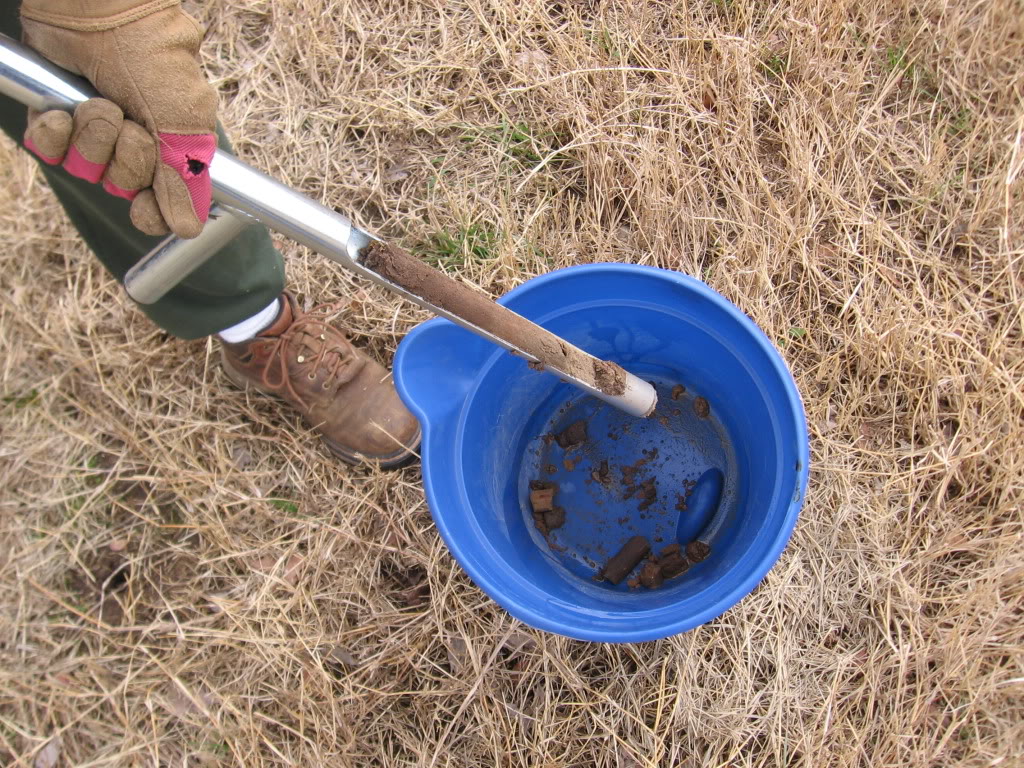 The soil test identifies the texture of the soil (clay, sandy, loamy). Most of the soils in this area are clay type soils, although amendments, drainage, site grading, soil additions and other factors can significantly change the soil type. Generally, only one soil sample is sent,  but additional samples may be called for. Twenty to 30 divits are taken throughout the property for one sample. Separate soil samples are recommended when there are significant site differences such as slopes, shade, wet or dry areas which could have different soil profiles and therefore different nutrient requirements. If different grass types are to be grown, additional samples may be recommended.  soil tester