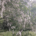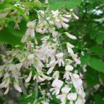 Yellowwoods begin to flower after about 10 years, usually in May and June, transforming the tree’s appearance from sturdily attractive to knockout gorgeous. The tiny inflorescences emerge with the leaves along the branch tips to form pendulous, panicled chains of fragrant, white, wisteria-like flowers that can reach lengths of 14 inches. The presence of a mature yellowwood in full bloom, on a warm June day, with perfumed garlands of flowers swaying in the breeze, attended by the gentle drone of thousands of honeybees, is an all-sensory delight that must be experienced to be believed.