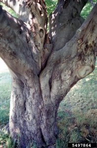 On January 3, 2022, the heavy, wet snow that destroyed thousands of trees in our area also damaged the smaller yellowwood, perhaps fatally. It took us a few days to notice that the trunk had developed a quarter-inch crack in the trunk just below the first set of limbs. Some of the limbs were themselves cracked and split.